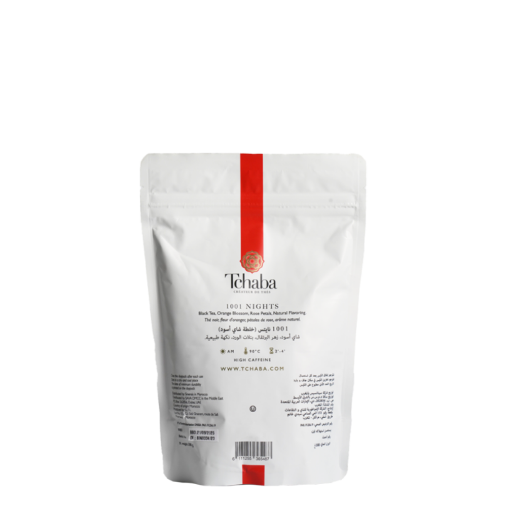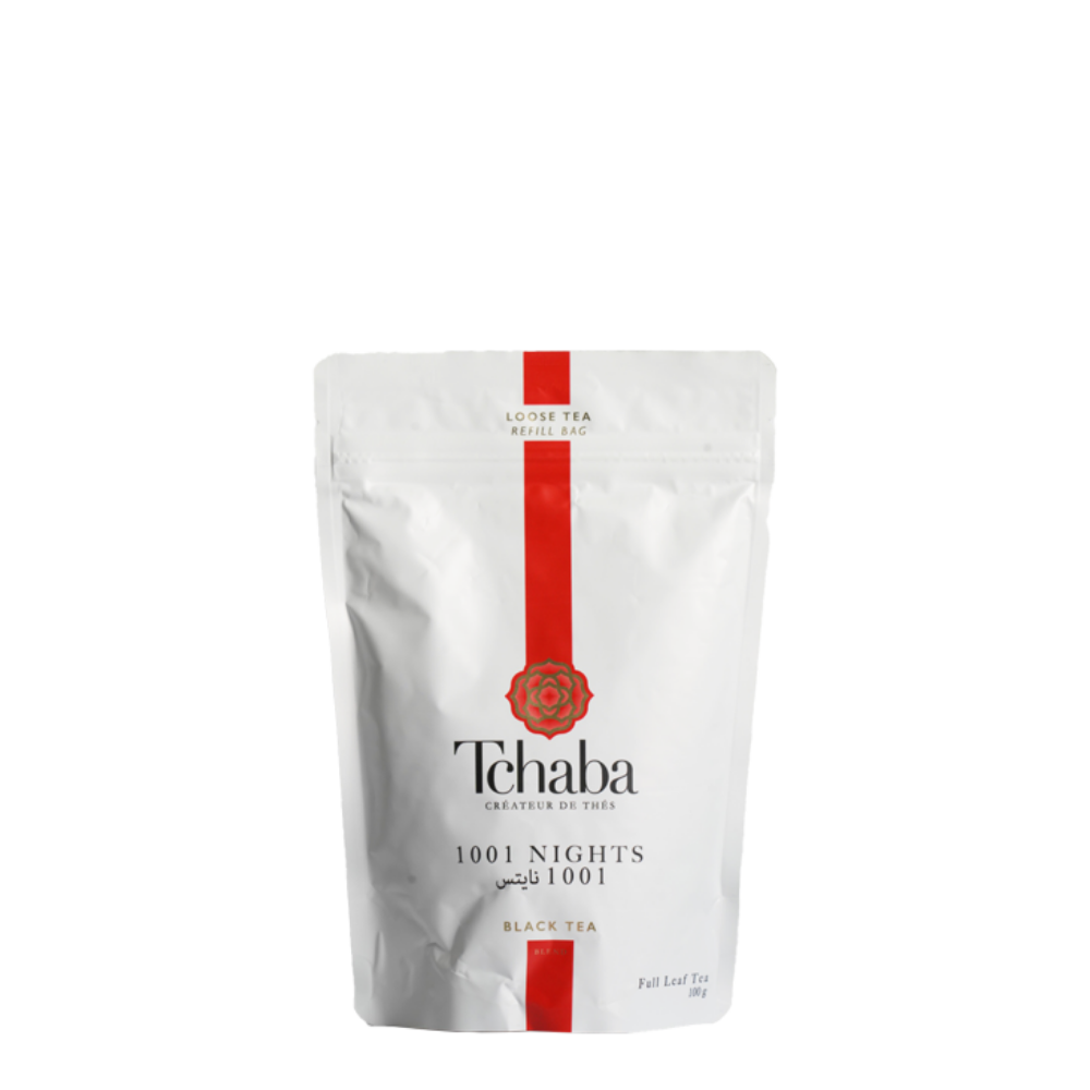 Tchaba 1001 Nights Tea is an exotic blend of green tea, rose petals, and citrus — floral and refreshing.